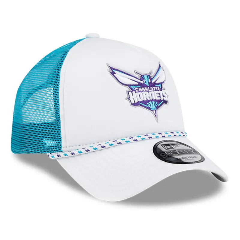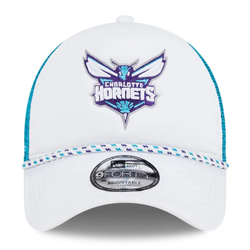• Top off any Charlotte Hornets look with this Court Sport Foam A-Frame 9FORTY Trucker hat from New Era. It features an embroidered team graphic on the front crown and a decorative rope embellishment across the visor. Completed with mesh panels in the rear for breathability and comfort, this adjustable cap is an essential piece of headwear for all Charlotte Hornets fans.