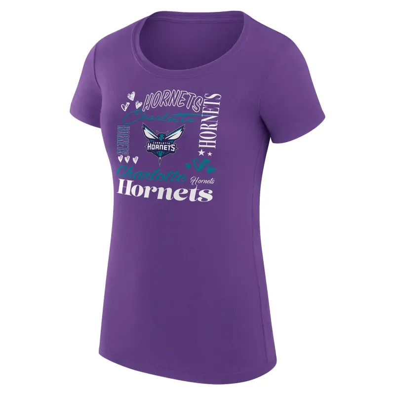 Home / Shop / Charlotte Hornets / Women’s Charlotte Hornets G-III 4Her by Carl Banks Purple Team Name Collage Fitted Graphic T-Shirt